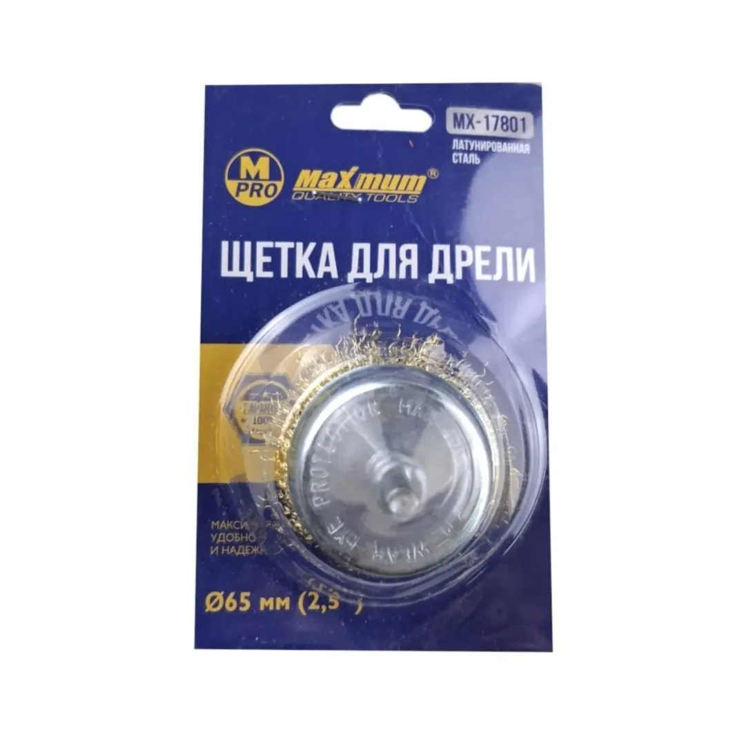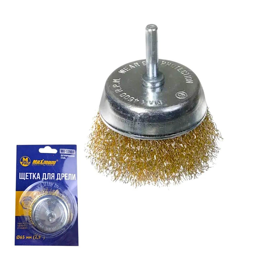 Щетка для дрели чашечная 65 мм с волнистой латунированной проволокой от «MAXIMUM» — это качественная, универсальная и безопасная щетка для широкого круга слесарных и подготовительных работ с использованием дрели. Шпилька — цилиндрический хвостовик диаметром 6 мм — предназначена для установки в шуруповерты и дрели.