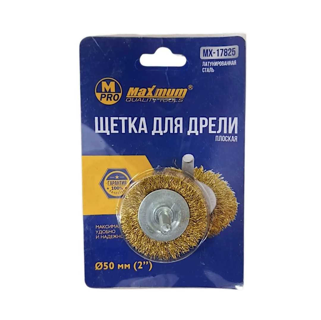 Плоская щетка с проволочной щетиной из латуни 50 мм от "MAXIMUM QUALITY TOOLS" крепится на дрель или шуруповерт через резьбовую шпильку.